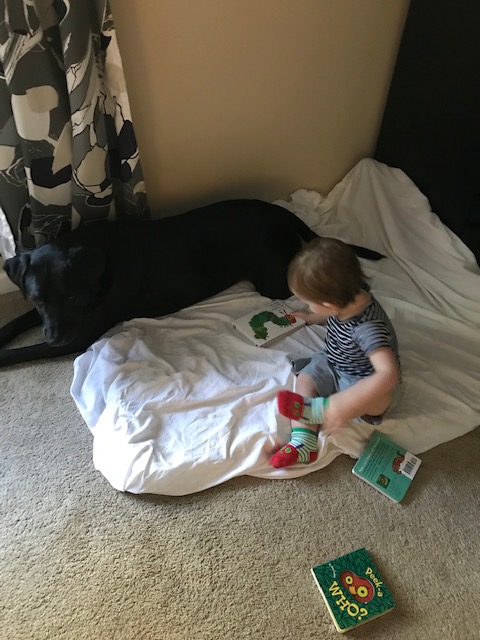 Hi baby. Today I got to wake you up. Mom and Dad opened the door for me and I do all the work of walking in, sniffing your bed, and settling into the corner so when you pretend to be sleeping, but actually looking up, you’ll see me. We got to play outside, that was my favorite part of today. You say, “BAAAAAAAA-BAAAAA,” which mom and dad translate as ball, L’s are hard to pronounce, I agree. Usually I just skip consonants, they’re overrated and being a dog it’s all about the vowel sounds when you have to talk loud enough for the dogs one street over to hear you. But, that’s another story. Anyway, yeah, the play times outside was the bestest part of today. I loved when you gave me hugs too, on the bed. I licked your face. That was nice.