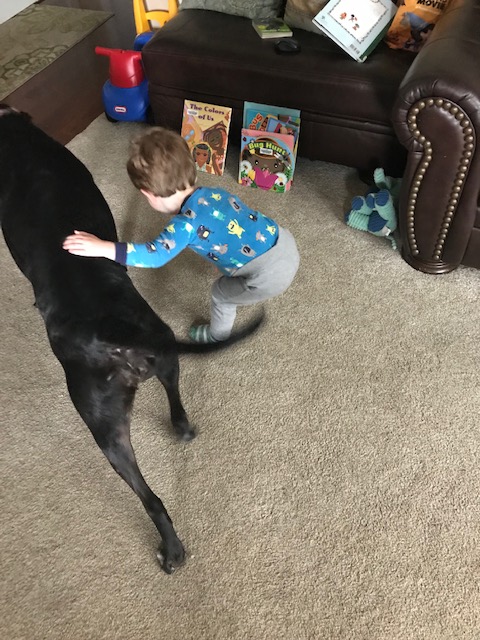 Sometimes I get really excited and I will push past you to run inside, or go somewhere. Sorry about that little dude. I don’t mean to, I just have lots of fun energies inside my paws. They make me spring and jump sometimes. I don’t do that with you, but I do run, run, run, and get it out when we’re outside or when we play with the ball. You threw the ball a lot for me today. You tried to chew the ball and that was funny because I wanted to chew it too! We have the same basic instincts, us doggies know what’s good stuff.