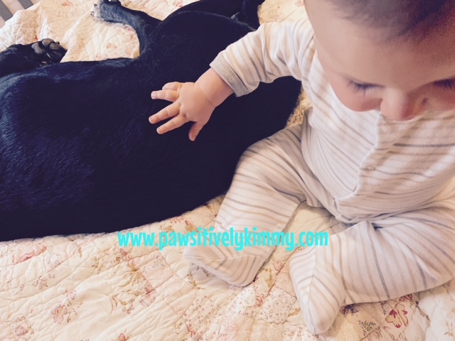 Mama said that you’re our sister and that we are working on being kind with our touches when I pet you. I know that I get SUPER excited whenever I see you. I talk to you all the time and sometimes you talk back to me. Oh yeah! That brings me back to the point I was making earlier. Ha, I almost forgot! Ok, what was it again? Oh yes, what were you saying to me when you kept sighing? What does that mean? I want to know so that I can understand you better doggy. Alright, well, I love you to the moon and back Kimmy doggy. That’s something that mama says to brother and I.